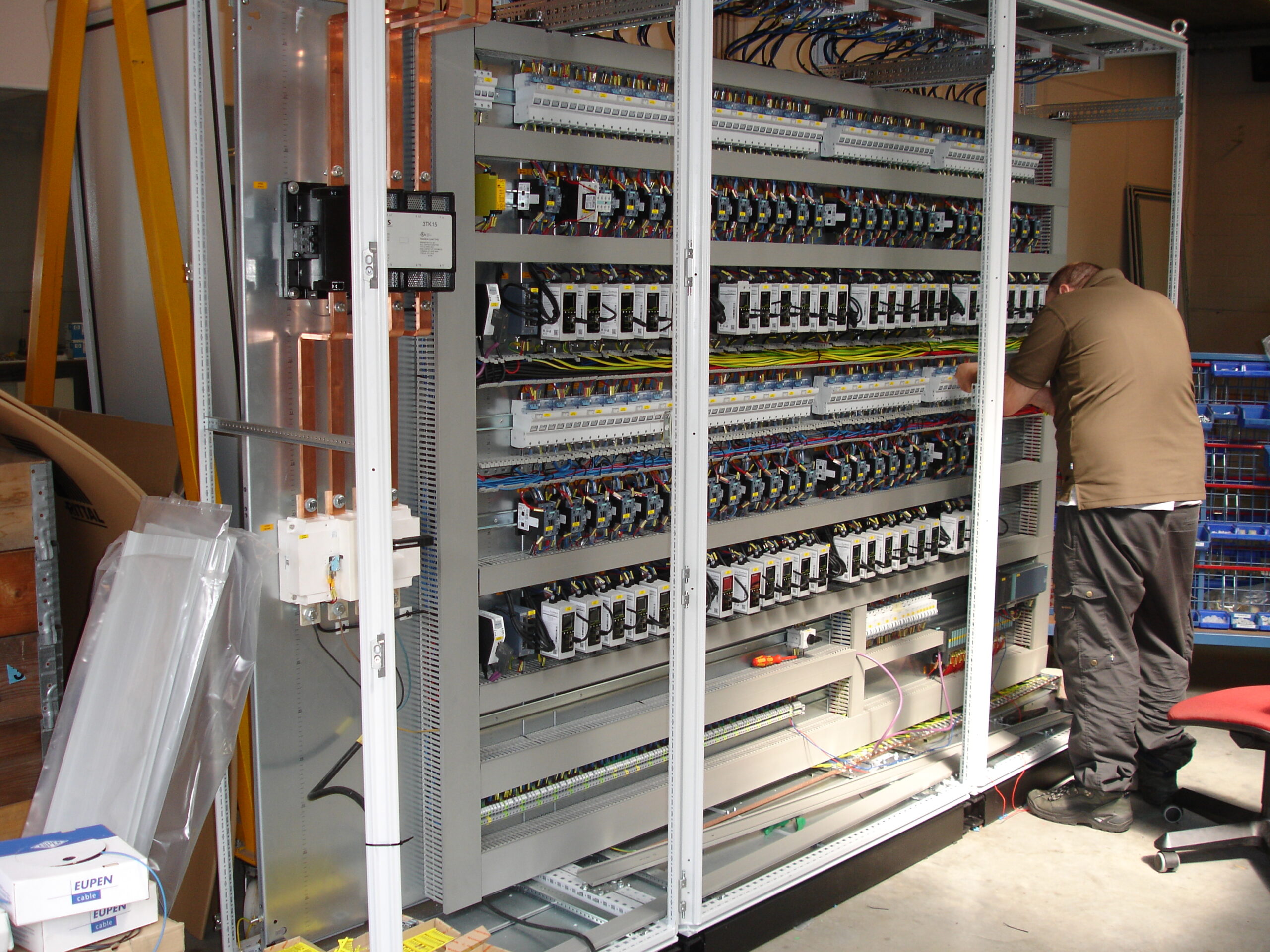 Voortgaand op de schema’s en de constructietekeningen zijn elektriciens en monteurs actief met de montage en bedrading van de verschillende projecten.